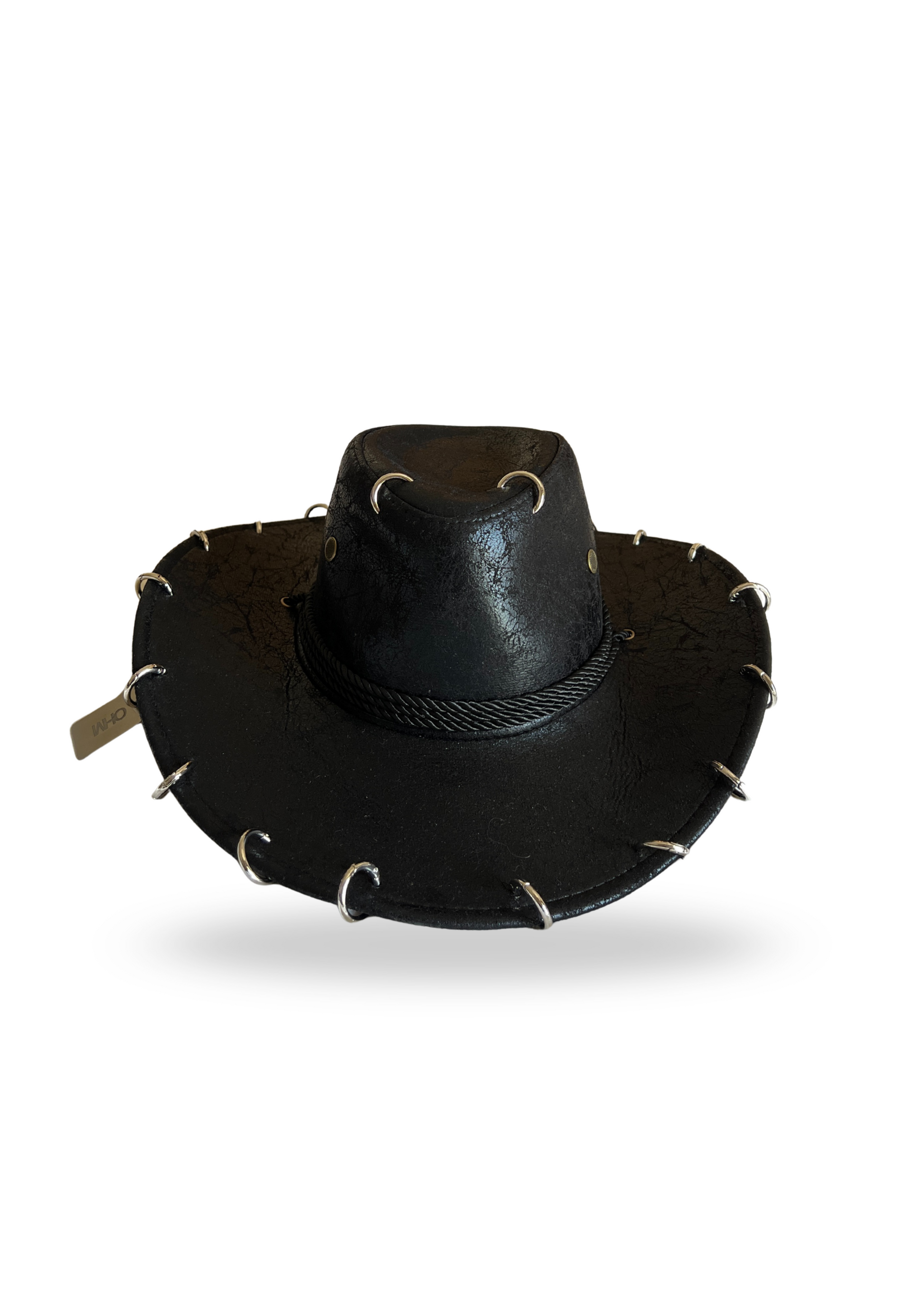 The Halo Hat is a bold twist on the classic cowboy silhouette with a matte black finish, silver ring accents, and a twisted rope trim. Its structured shape and adjustable chin cord make it both stylish and functional—perfect for festivals, streetwear, or adding a rebellious edge to any look.