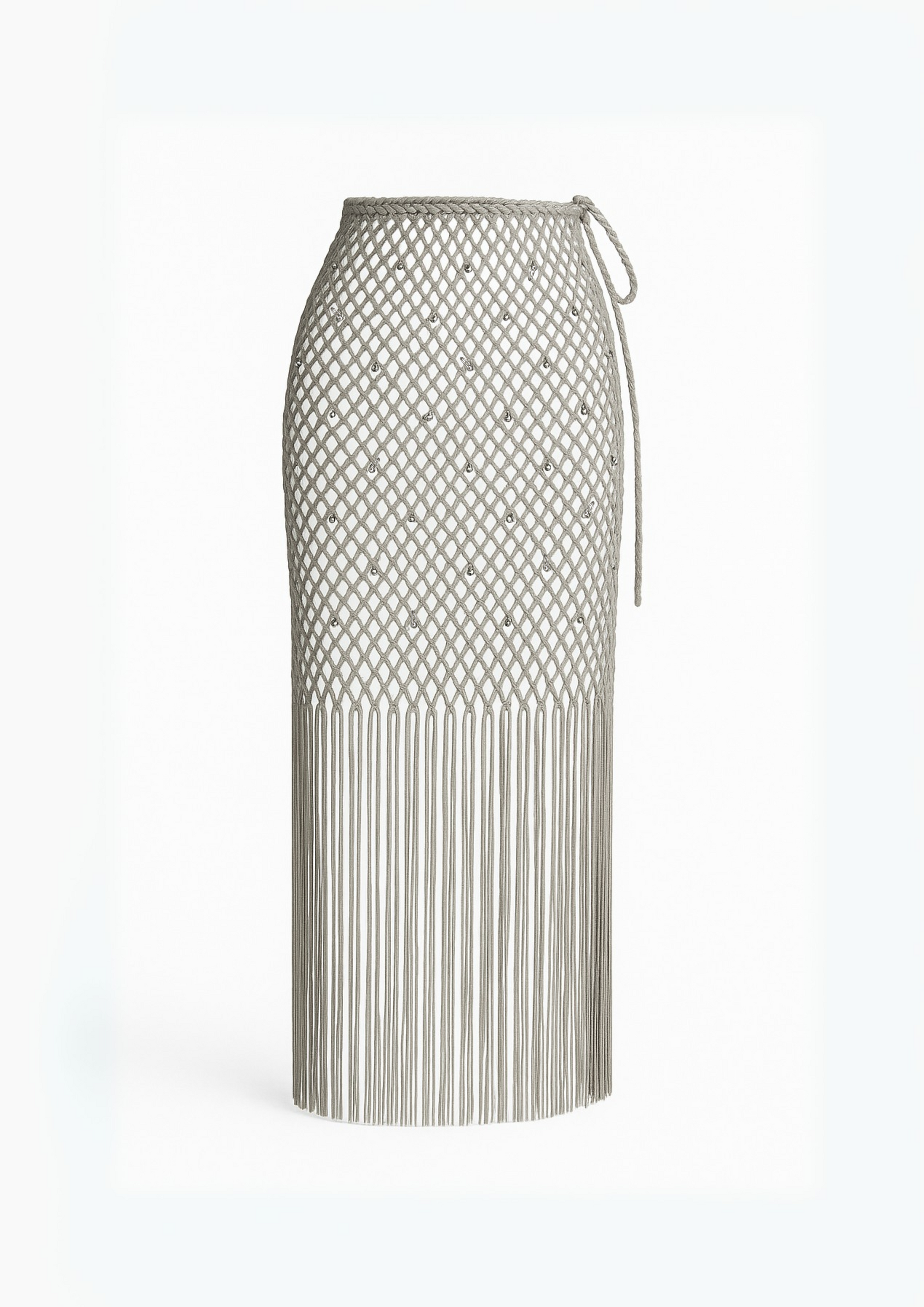 Sculptural, sheer, and statement-making. The intricate macramé design creates an open, perforated texture that wraps effortlessly around the waist. Long fringe flows from every knot, adding movement to each step.